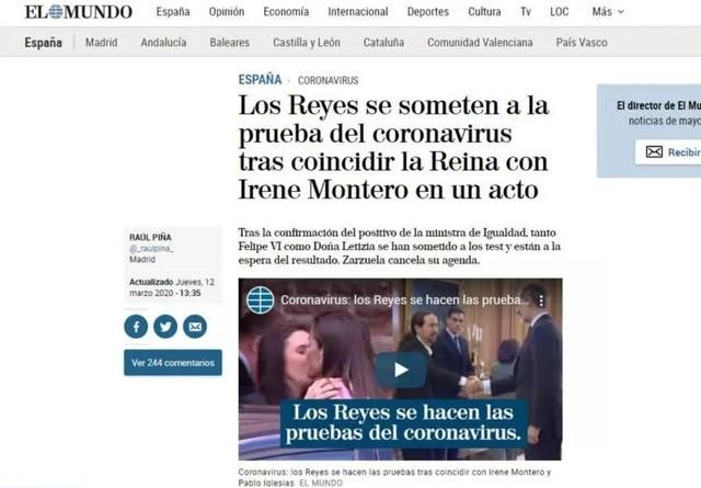 在蒙特罗确诊之后,西班牙国王及王后均接受新冠病毒检测。